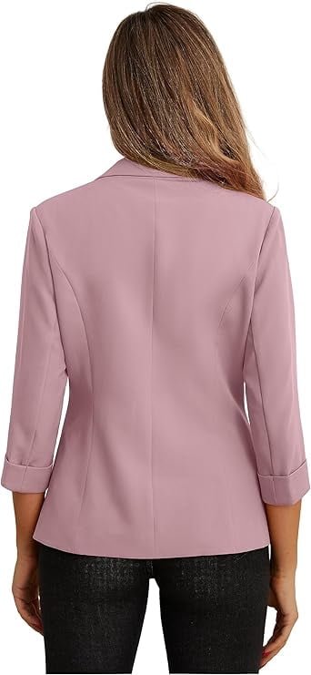 JWD Women’s Casual 3/4 Ruched Sleeve Blazer – Slim Fit Open Front Notched Lapel Work Office Suit Jacket with Pockets Pink 12