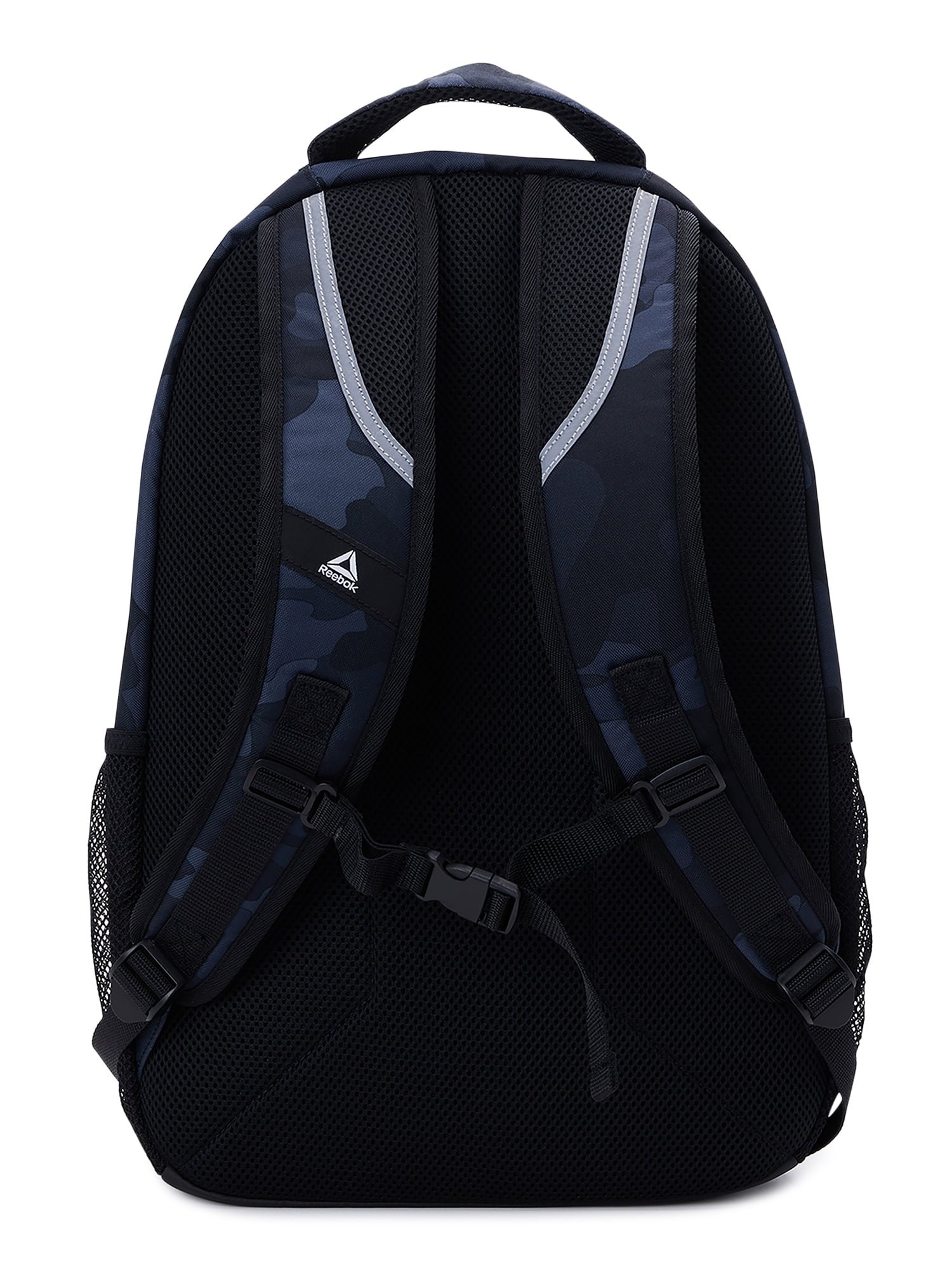 - Exterior Features: Zipper closure; side mesh pockets; padded, adjustable straps; padded mesh top carry handle; key fob; reflective tape; front zipper pocket; camo panels