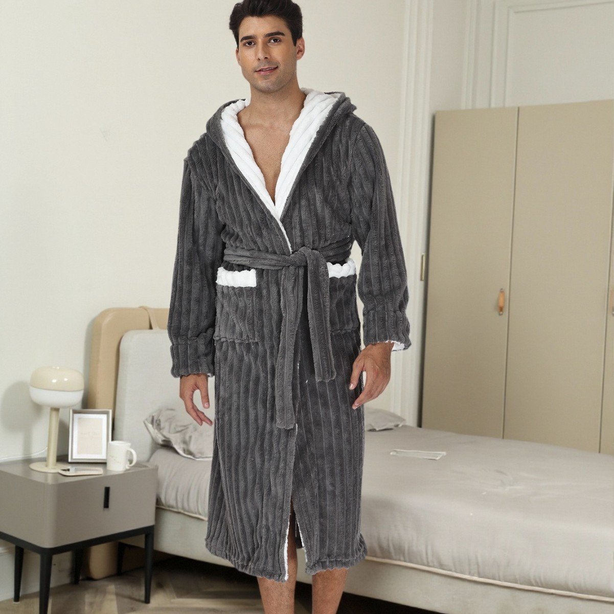 Thick Night-robe Flannel Men’s Long Hooded Lace Bathrobe