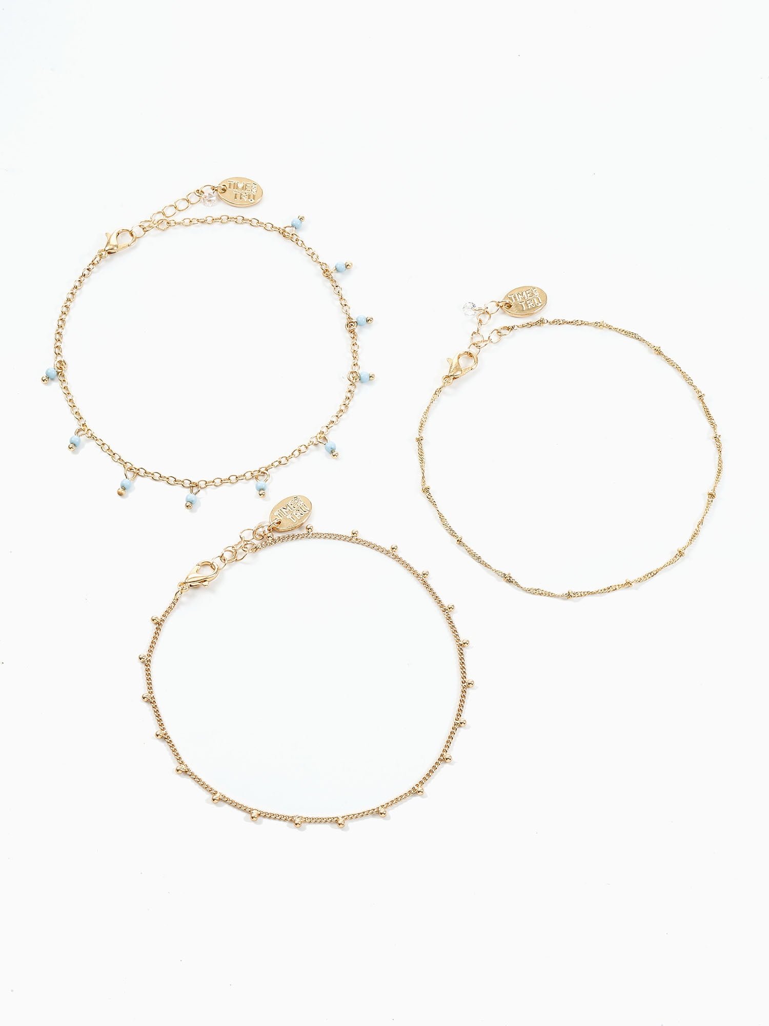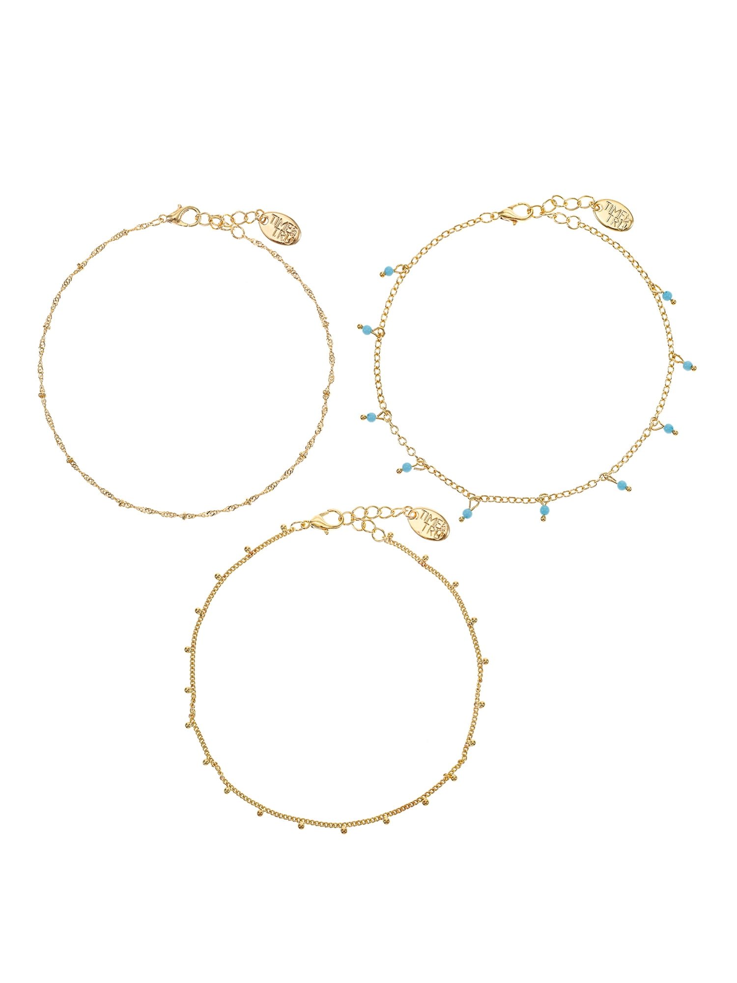 Time and Tru Turquoise Layered Anklet Set, Fashion Jewelry, Goldtone, 3 Pieces, 9.5 in, withExtender